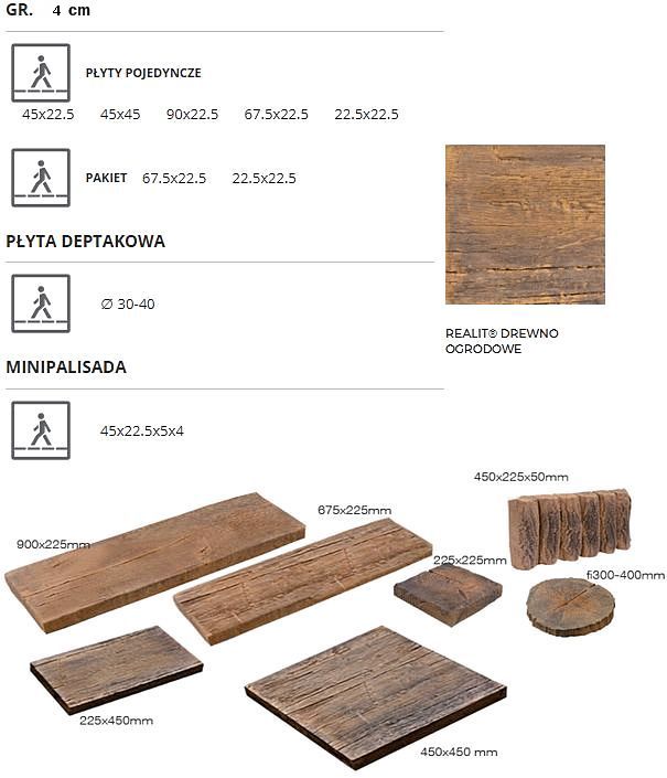 Produkt firmy BrukBet cieszący się ogromną popularnością. Odwzorowuje dokładnie fakturę i kolorystykę naturalnego drewna, przewyższając je nieporównanie trwałością i odpornością na warunki atmosferyczne i degradację biologiczną. Drewno Ogrodowe Realit to urokliwy system płyt-desek, kopyt oraz krążków z wyschniętego drewna o wyrazistych słojach. Trudno uwierzyć, że wykonane są z betonu. Materiał ten nieporównywalnie wydłuża czas użytkowania w stosunku do drewna naturalnego. Płyty Drewno Ogrodowe wykorzystywane są do placyków, ścieżek ogrodowych, obrzegowania rabat kwiatowych oraz stopni schodowych. Wspaniale komponują się z zielenią oraz żwirem otoczaków.