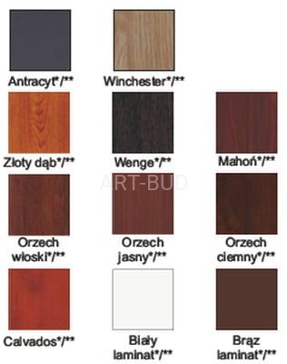 | Kolory | ANTRACYT, WINCHESTER, ZŁOTY DĄB, WENGE, MAHOŃ, ORZECH WŁOSKI, ORZECH JASNY, ORZECH CIEMNY, CALVADOS, BIAŁY LAMILAT, BRĄZ LAMILAT |