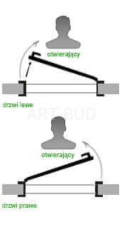 Kierunek drzwi (lewe lub prawe) określa się stając przed drzwiami od strony, w której otwiera się je "na siebie".