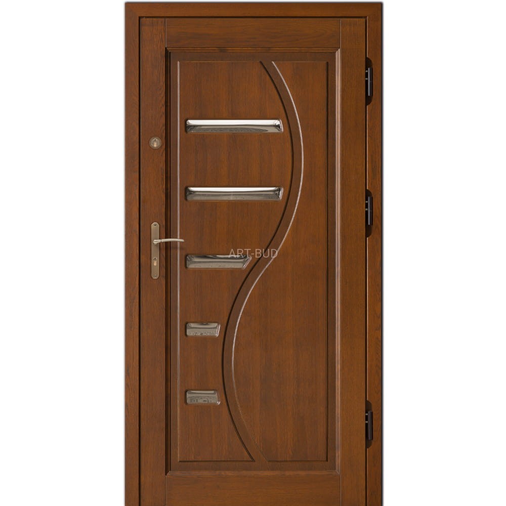 Najwyższej jakości zewnętrzne drzwi drewniane dębowe grubości 75 mm, ocieplone wewnętrzną warstwą pianki poliuretanowej. Oferowane w komplecie z drewnianą ościeżnicą z progiem aluminiowym i szeregiem akcesoriów w standardzie. Opcjonalnie, drzwi te są również oferowane w wersji energooszczędnej o grubości 100 mm, gdzie współczynnik przenikalności cieplnej wynosi zaledwie U-0,49.