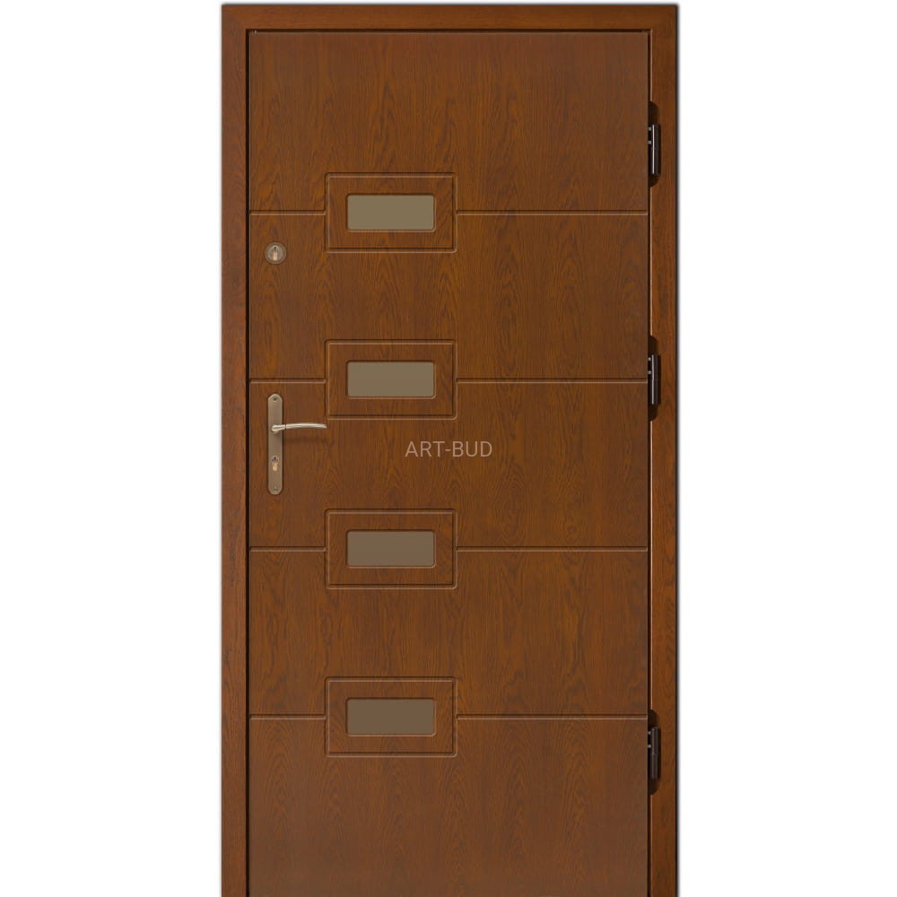 Najwyższej jakości zewnętrzne drzwi drewniane dębowe grubości 75 mm, ocieplone wewnętrzną warstwą pianki poliuretanowej. Oferowane w komplecie z drewnianą ościeżnicą z progiem aluminiowym i szeregiem akcesoriów w standardzie. Opcjonalnie, drzwi te są również oferowane w wersji energooszczędnej o grubości 100 mm, gdzie współczynnik przenikalności cieplnej wynosi zaledwie U-0,49.