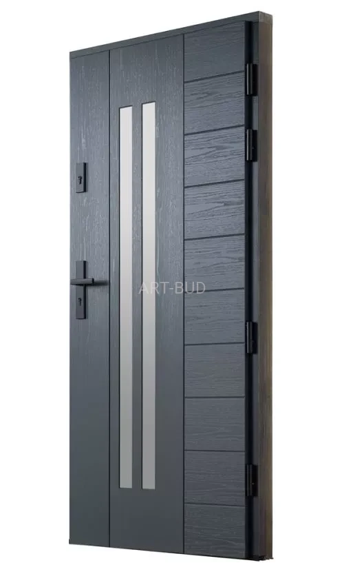 Najwyższej jakości zewnętrzne drzwi drewniane dębowe grubości 75 mm, ocieplone wewnętrzną warstwą pianki poliuretanowej. Oferowane w komplecie z drewnianą ościeżnicą z progiem aluminiowym i szeregiem akcesoriów w standardzie. Opcjonalnie, drzwi te są również oferowane w wersji energooszczędnej o grubości 100 mm, gdzie współczynnik przenikalności cieplnej wynosi zaledwie U-0,49.