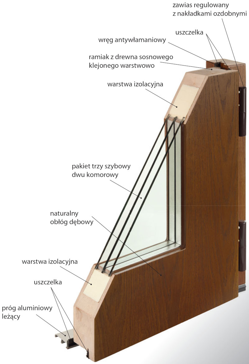 Najwyższej jakości zewnętrzne drzwi drewniane dębowe grubości 75 mm, ocieplone wewnętrzną warstwą pianki poliuretanowej. Oferowane w komplecie z drewnianą ościeżnicą z progiem aluminiowym i szeregiem akcesoriów w standardzie. Opcjonalnie, drzwi te są również oferowane w wersji energooszczędnej o grubości 100 mm, gdzie współczynnik przenikalności cieplnej wynosi zaledwie U-0,49.