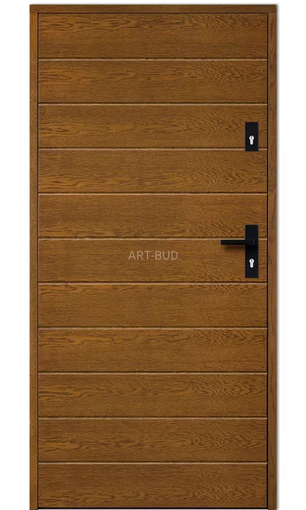 Najwyższej jakości zewnętrzne drzwi drewniane dębowe grubości 75 mm, ocieplone wewnętrzną warstwą pianki poliuretanowej. Oferowane w komplecie z drewnianą ościeżnicą z progiem aluminiowym i szeregiem akcesoriów w standardzie. Opcjonalnie, drzwi te są również oferowane w wersji energooszczędnej o grubości 100 mm, gdzie współczynnik przenikalności cieplnej wynosi zaledwie U-0,49.