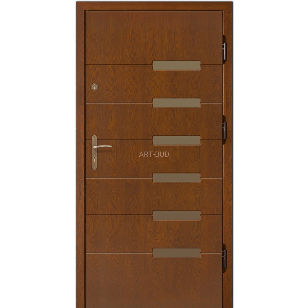 Najwyższej jakości zewnętrzne drzwi drewniane dębowe grubości 75 mm, ocieplone wewnętrzną warstwą pianki poliuretanowej. Oferowane w komplecie z drewnianą ościeżnicą z progiem aluminiowym i szeregiem akcesoriów w standardzie. Opcjonalnie, drzwi te są również oferowane w wersji energooszczędnej o grubości 100 mm, gdzie współczynnik przenikalności cieplnej wynosi zaledwie U-0,49.