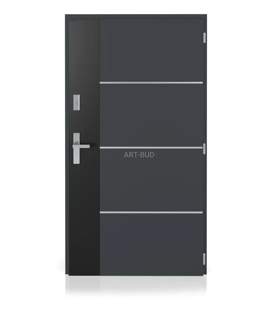 Skrzydło drzwi składa się z arkuszy blachy stalowej przedzielonych grubą płytą XPS. Natomiast ościeżnica została wykonana z trzykomorowych kształtowników aluminiowych z przegrodą termiczną. Współczynnik przenikania ciepła Ud wynosi 1,3 W/m2K, dlatego drzwi skutecznie chronią przed chłodem. Izolacja akustyczna to 20 dB.