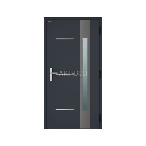 Drzwi zewnętrzne NOVA jednoskrzydłowe składają się z ościeżnicy wykonanej z kształtowników aluminiowych trzykomorowych, z przegrodą termiczną o głębokości 77 [mm] oraz skrzydła z grubą przylgą o grubości 78 [mm] wykonanego z blachy stalowej o grubości 0,75 [mm] i wypełnienia pianką PU.