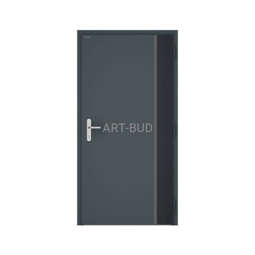 Drzwi zewnętrzne NOVA jednoskrzydłowe składają się z ościeżnicy wykonanej z kształtowników aluminiowych trzykomorowych, z przegrodą termiczną o głębokości 77 [mm] oraz skrzydła z grubą przylgą o grubości 78 [mm] wykonanego z blachy stalowej o grubości 0,75 [mm] i wypełnienia pianką PU.