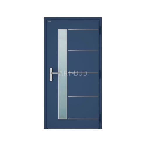 Drzwi zewnętrzne NOVA Wiśniowski wzór 020 z aplikacją jednostronną ze stali nierdzewnej - ramka na około szyby ,5 pasków poziomych 15mm umieszczonych od strony zawiasów. Szyba dwukomorowa obustronnie bezpieczna 44.2//44.2 U=0,5 umieszczona pomiędzy blachami poszycia, od strony klamki/uchwytu. Blacha wewnętrzna z otworem pod szybą wpuszczaną, gładka.