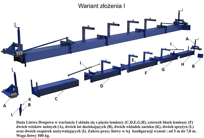 Listwa drogowa DLD to niezbędne narzędzie przy pracach brukarskich na szerokich ciągach pieszych lub drogach brukowanych. Podłoże dużych powierzchni, na których ma zostać ułożona kostka lub masa bitumiczna musi być najpierw dobrze przygotowana. Jeżeli chcemy to zrobić w sposób wydajny i oszczędny, należy ten proces zmechanizować. Wymaga to jednak zastosowania odpowiednich narzędzi. W tym celu firma Mimal opracowała specjalną listwę drogową. Duża Listwa Drogowa składa się z dwóch bocznych rolek prowadzących, których wysokość jest płynnie regulowana w stosunku do lemieszy listwy w zakresie od 4 do 33 cm, oraz zapewnia płynną regulacje, w zależności od potrzeby wykonywanych robót – dla niwelacji ze spadkiem daszkowym, ściekiem środkowym lub spadkiem jednostronnym. Dzięki solidnej konstrukcji i bardzo sztywnym profilom, istnieje możliwość płynnej regulacji w zakresie od 1,6 m do 7,8 m w zależności od typu złożenia. Duża Listwa Drogowa dostępna jest w różnych konfiguracjach oraz z różnymi specjalistycznymi lemieszami. Oznacza to, że duże powierzchnie mogą zostać szybko wyrównane i wyprofilowane za jednym przejściem maszyny, co czyni twoją pracę bardziej wydajną, dzięki czemu oszczędzasz czas i pieniądze. Listwa DLD jest idealnym rozwiązaniem dla firm brukarskich, drogowych oraz dla firm zajmujących się budową obiektów sportowych, podczas przygotowywania podłoża, zarówno na średnich jak i dużych powierzchniach. Dzięki zastosowaniu konstrukcji wielomodułowej, jest łatwa w transporcie. Powierzchnie malarskie wykonane metodą proszkową zapewniają jej trwałość oraz estetykę.