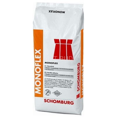 Cementowa zaprawa o podwyższonych parametrach do klejenia płytek wewnątrz i na zewnątrz pomieszczeń. MONOFLEX przeznaczony jest jako zaprawę cienkowarstwową do układania wielkoformatowych płyt z kamionki szlachetnej, fajansu i innych okładzin ceramicznych. Charakteryzuje się niską absorpcją wody na poziomie ≤ 0,5% (kamionka porcelanowa) klinkieru, mozaiki i nieprzezroczystych płytek z kamienia naturalnego, niepodatnych na odbarwienia. Dzięki podatności na formowanie klej MONOFLEX jest odpowiedni do układania dużych formatów.Nadaje się do niezawodnego układania na wszystkich podłożach zgodnie z DIN 18157, Część 1, np. beton, beton komórkowy, tynk, jastrych anhydrytowy/ogrzewany, mury oraz płyty gipsowo kartonowe, itp., jak również na starych, mocno związanych okładzinach ceramicznych. Produkt jest również odpowiedni do klejenia lekkich płyt budowlanych, np. z ekstrudowanego polistyrenu, oraz do układania płytek na mineralnych i dyspersyjnych uszczelnieniach zespolonych SCHOMBURG.