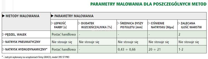 Emulsja przeznaczona jest do dekoracyjnego malowania ścian i sufitów z zapraw cementowych, cementowo-wapiennych, wapiennych, gipsowych, płyt gipsowo-kartonowych, drewnianych i z materiałów drewnopochodnych wewnątrz pomieszczeń.