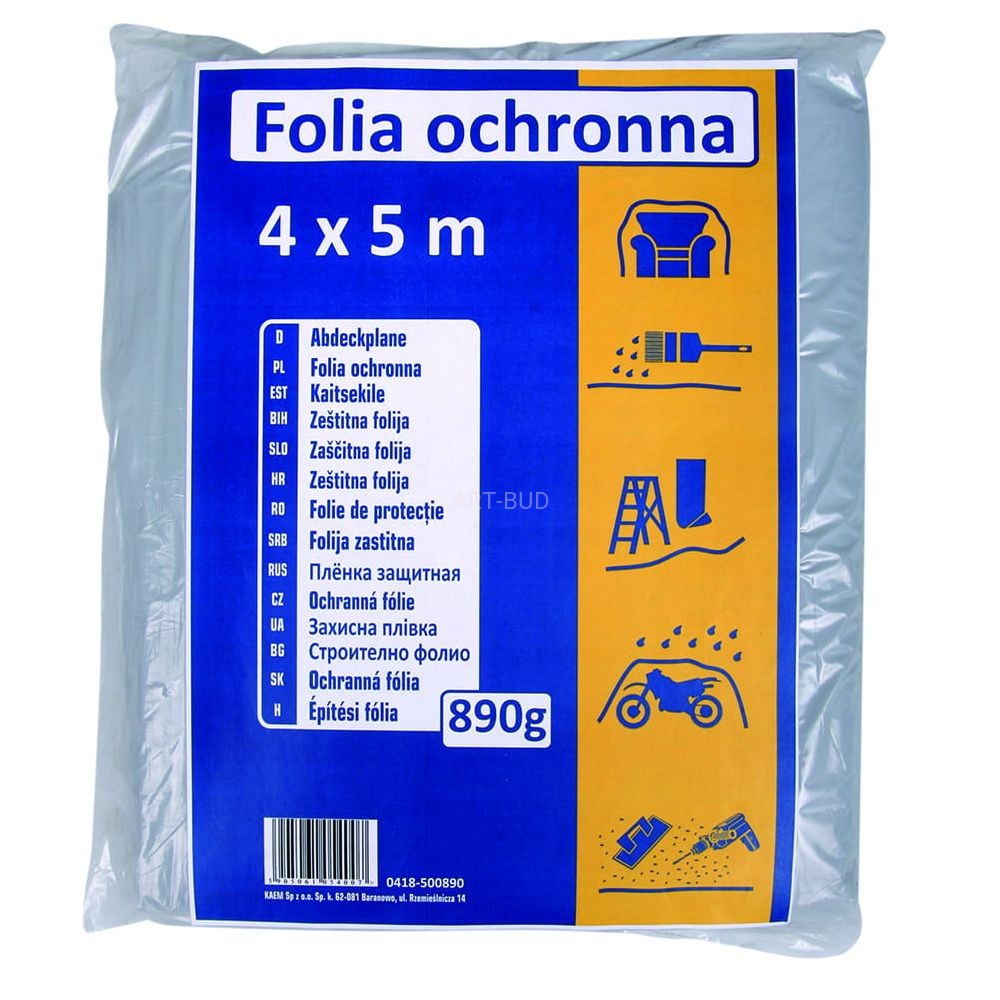 Gruba folia ochronna o gramaturze 890 g i wymiarach 4x5 metrów.