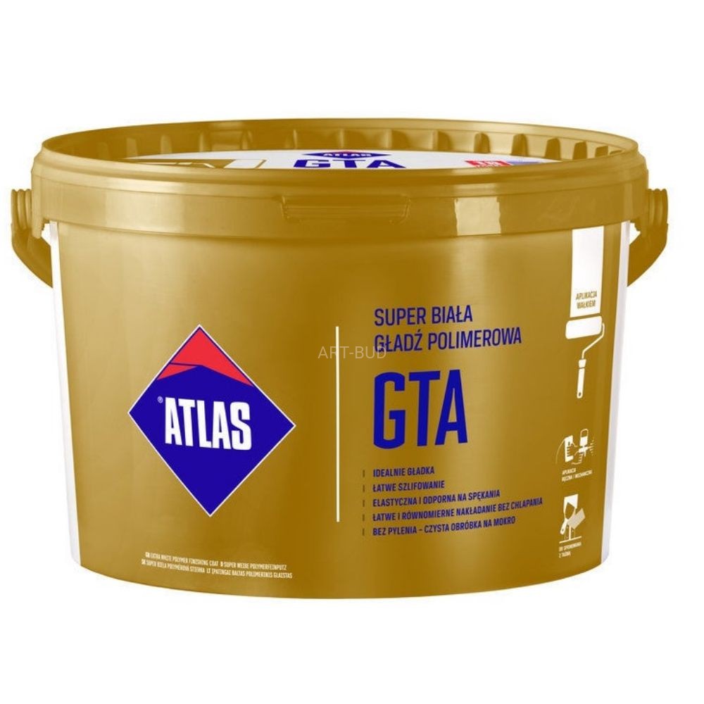ATLAS GTA produkowana jest jako masa na bazie spoiw żywicznych, wypełniaczy mineralnych i dodatków modyfikujących. Idealnie biała, idealnie gładka. Selekcjonowane śnieżnobiałe wypełniacze mineralne o optymalnym uziarnieniu umożliwiają uzyskanie bardzo gładkiej powierzchni bez poprawek. Optymalna konsystencja do nakładania i profilowania - specjalne dobrane parametry reologiczne pozwalają na łatwą aplikację pacą, wałkiem i agregatem. Gładź idealnie się profiluje, pozwala uzyskać gładką powierzchnię już od pierwszego zaciągnięcia. Szybka aplikacja wałkiem – wyjątkowa konsystencja oraz wydłużony czas otwarty pozwalają na komfortową aplikację wałkiem w krótkim czasie. Gładź równomiernie się rozprowadza i nie chlapie. Wytrzymała i elastyczna - elastyczne wiązania polimerowe zapewniają wysoką przyczepność i odporność na pękanie szpachlowanych powierzchni. Wszystkie poziomy szpachlowania gipsowego: PSG1(Q1), PSG2(Q2), PSG3(Q3), PSG4(Q4). Bezpieczna aplikacja drugiej warstwy „mokre na mokre” - skrócenie czasu realizacji i minimalne ryzyko powstawania pęcherzy. Obróbka „na mokro” - wygładzanie na mokro umożliwia uzyskanie gładkiej powierzchni bez pylenia, pozwala na szybkie i czyste realizowanie prac remontowych. Do szlifowania ręcznego i mechanicznego - uzyskiwana twardość pozwala na łatwą obróbkę powierzchni, zarówno ręcznie jak i mechanicznie.