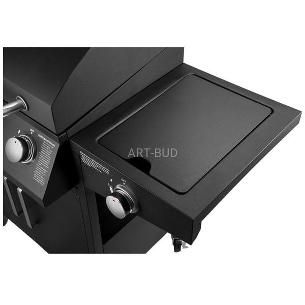 Grill jest mobilny, wyposażony w 4 kółka z hamulcem na solidnych nogach. Kluczowym wyróżnikiem modelu jest pojemna komora grillowa. Wśród dodatkowych, funkcjonalnych zalet modelu można wskazać m.in. korytko na węgiel, wywietrzniki oraz termometr do sprawdzania temperatury. Pokrętła regulacji umożliwiają wygodną regulację temperatury grillowania potraw.