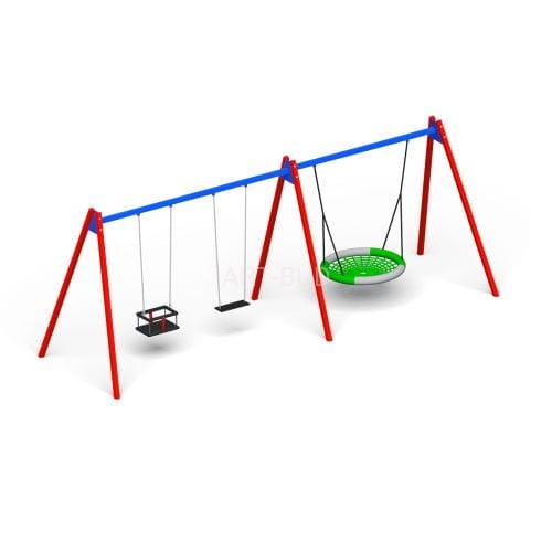 Klasyczna huśtawka metalowa potrójna z siedziskami dla dzieci w różnym wieku. Elementy nośne zestawu wykonane z metalu zabezpieczonego antykorozyjnie i malowanego proszkowo Elementy mocowań wykonane ze stali węglowej konstrukcyjnej są malowane proszkowo lub ocynkowane. Wszystkie połączenia śrubowe wykonane z użyciem elementów ocynkowanych, a ich końce zabezpieczone plastikowymi kapslami, poprawiającymi bezpieczeństwo.