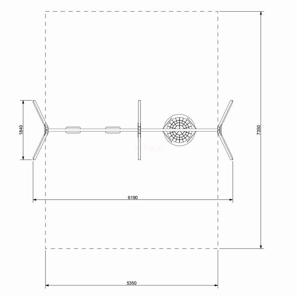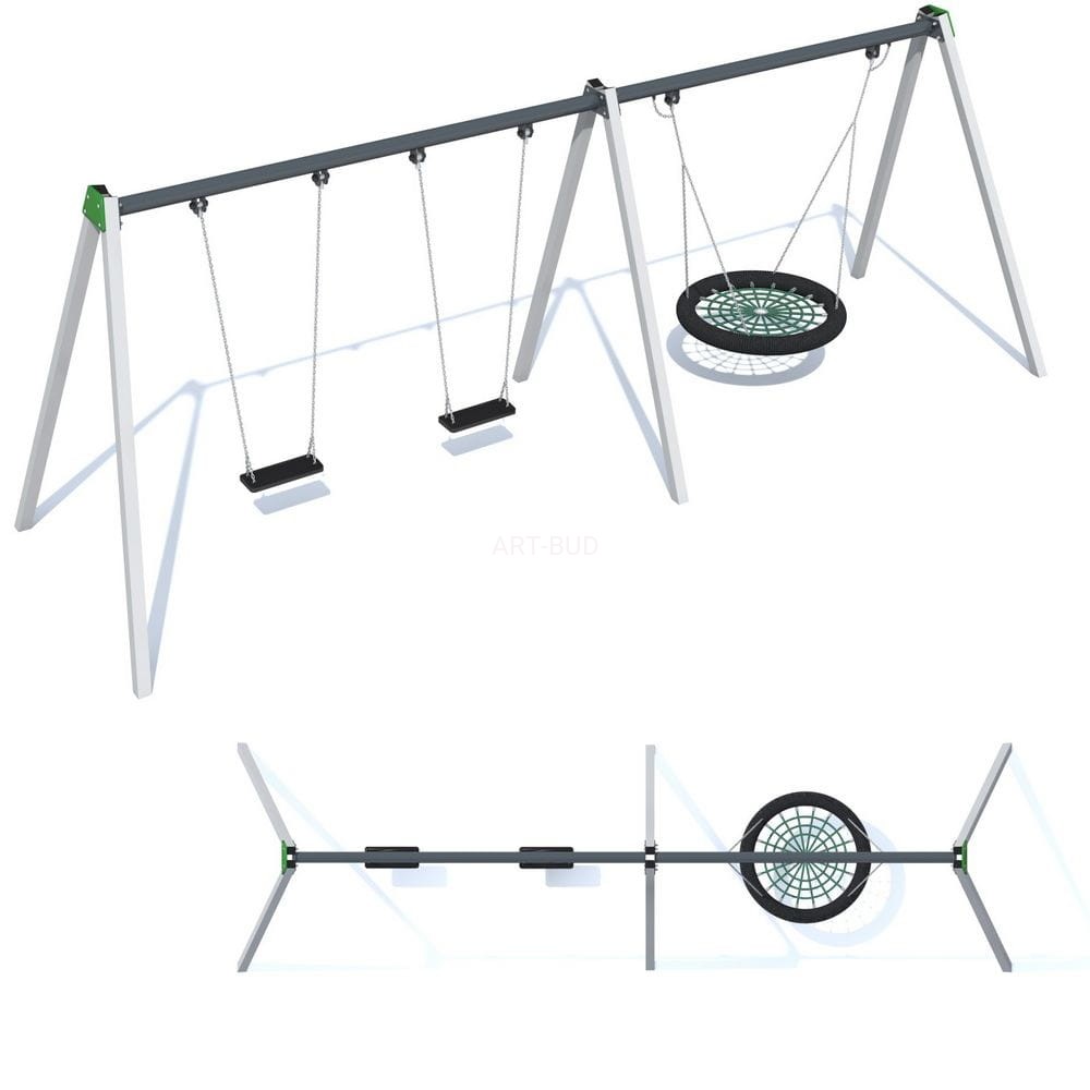 Huśtawka trzyosobowa z siedziskiem typu bocianie gniazdo oraz dwoma siedziskami typu deseczka. Konstrukcja wykonana ze stali ocynkowanej, malowanej proszkowo. Kolor konstrukcji RAL 9006, górna belka w kolorze RAL 7016.