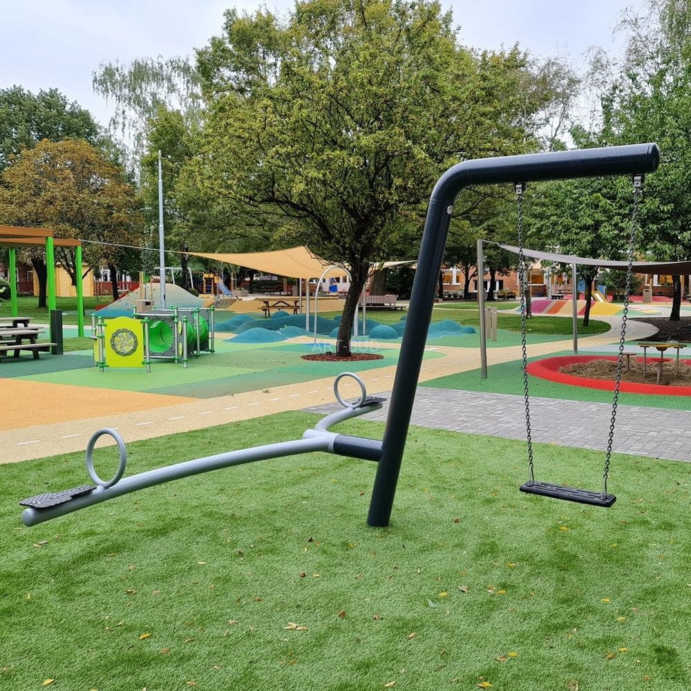 Huśtawka wahadłowa jednoosobowa zintegrowana z huśtawką wagową typu ważka wyposażona w system spowolniający opadanie ramion tzw. "slow system". Kolor konstrukcji jest grafitowy i szary, a kolor siedziska jest czarny.