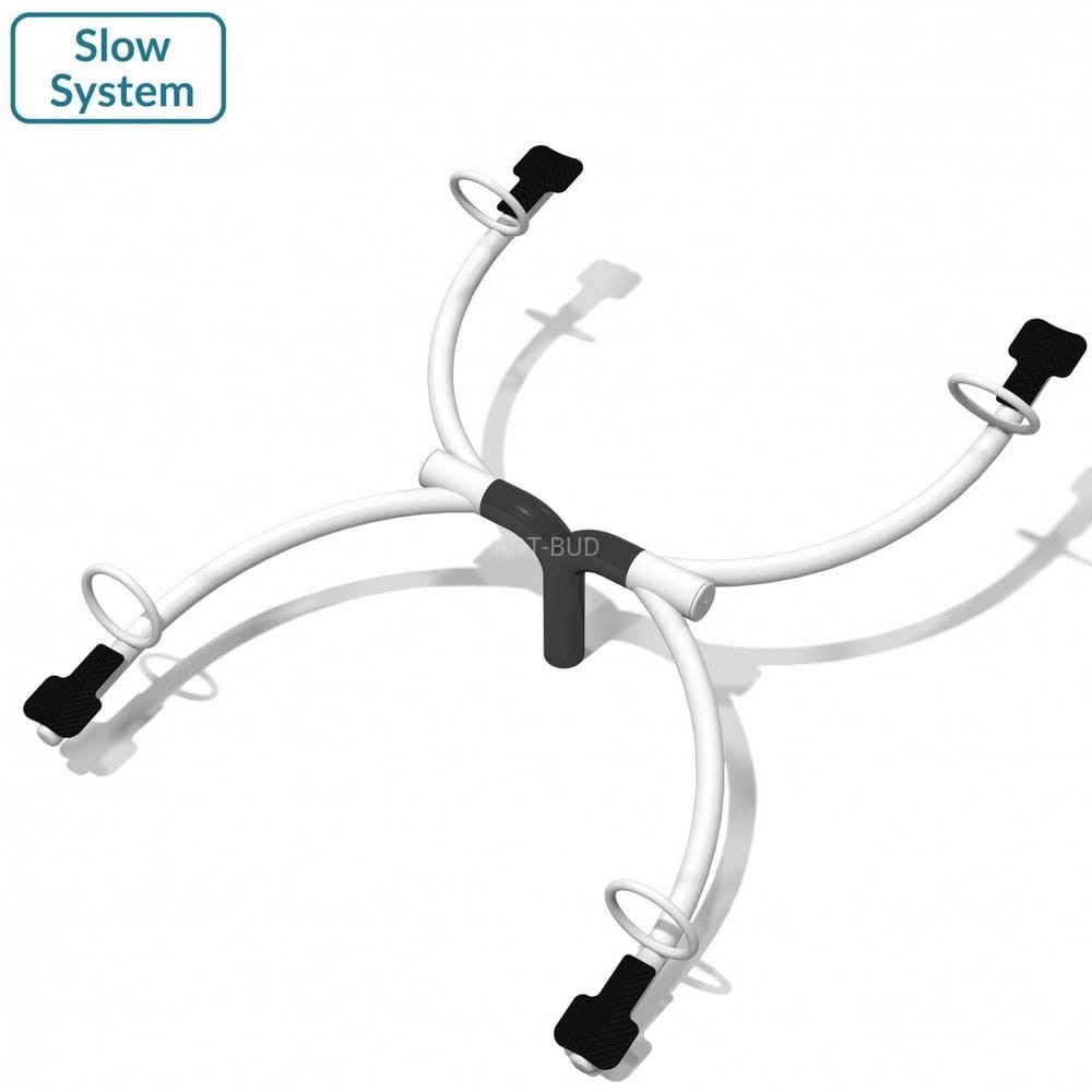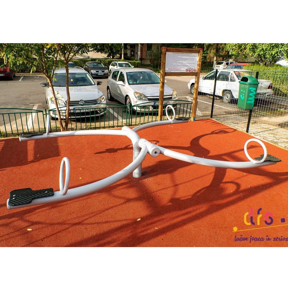 Dwie zintegrowane ze sobą huśtawki wagowe typu ważka wyposażone w system spowalniający opadanie ramion tzw. "slow system". Kolor konstrukcji jest grafitowy i szary, a kolor siedziska jest czarny.