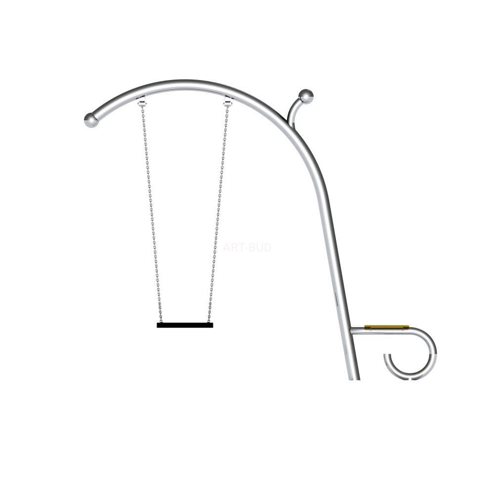 Huśtawka wahadłowa 1-siedziskowa w formie deseczki o stylistyce nawiązującej do kształtów ślimaka, z dodatkową ławeczką 1-osobową. Konstrukcja wykonana jest ze stali nierdzewnej, odpornej na warunki atmosferyczne i intensywne użytkowanie. Rura gięta, na której zawieszone jest siedzisko na łańcuchach, wykonana jest z jednego odcinka (nie dopuszcza się łączeń), zakończona jest kulistymi elementami dekoracyjnymi, przypominające czułki ślimaka. Siedzisko dodatkowe, oparte na spiralnej podstawce, wykonane jest z materiału HDPE o grubości 15 mm, co zapewnia bezpieczeństwo użytkowania oraz zapobiega nagrzewaniu się na słońcu oraz łatwemu zmrożeniu zimą. Urządzenie posiada certyfikat potwierdzający zgodność z normą PN-EN 1176-1:2017-12 i PN-EN 1176-2 + AC:2020-01. Certyfikat musi być ważny na dzień składania ofert. Przedstawiony rysunek produktu stanowi integralną część opisu – produkt musi być zgodny z przedstawionym wyglądem.