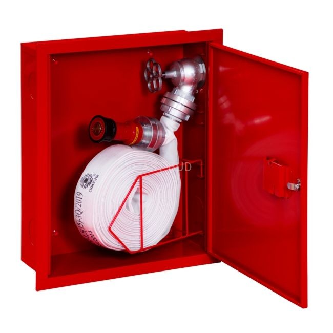 Hydrant wewnętrzny DN52 bez miejsca na gaśnicę, z wężem płaskoskładanym DN52 15 lub 20 metrów w koszu lub na bębnie, w szafce wnękowej, z zaworem DN52 oraz prądownicą mosiężną płynnie regulowaną między prądem zwartym a rozproszonym. Istnieje możliwość dopasowania produktu do potrzeb klienta.