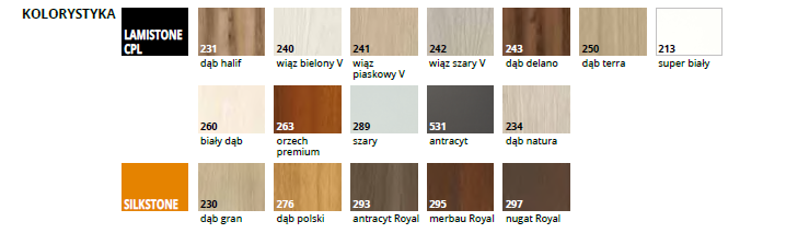 standard: szkło biały mat o grubości 4 mm w kolorystyce: biały dąb,