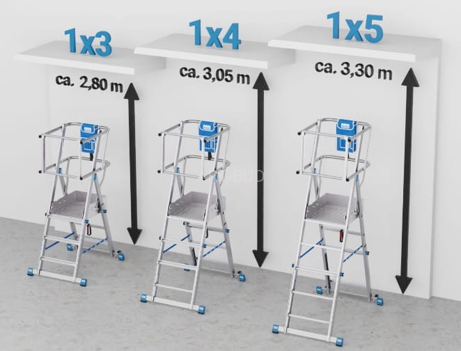 - W wersji podestu od 1x3 do 1x5 szczebli oferowana wysokość robocza wynosi: od 2,80 m do 3,30 m; w wersji podestu od 1x5 do 1x9 szczebli wysokość robocza wynosi: od 3,30 m do 4,35 m