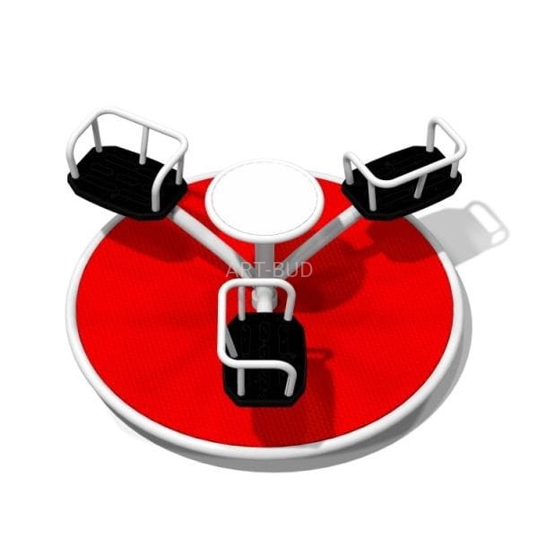 Zabawka typu karuzela tarczowa 3-ramienna z kierownicą napędową. Średnica wynosi 1,58 m. Podłoga karuzeli jest wykonana z płyty PE dzięki czemu jest miękka (bezpieczna), antypoślizgowa (dodatkowa antypoślizgowa faktura) oraz nie ulega nagrzewaniu na słońcu oraz zmrożeniu zimą.