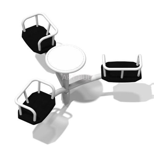 Karuzela trzyosobowa z antypoślizgowymi siedziskami z oparciem. Wykonana ze sali ocynkowanej, malowanej proszkowo. Przeznaczona dla dzieci w wieku od 3 do 16 roku życia.