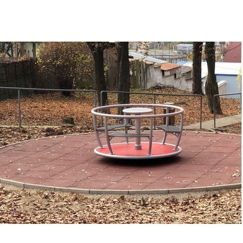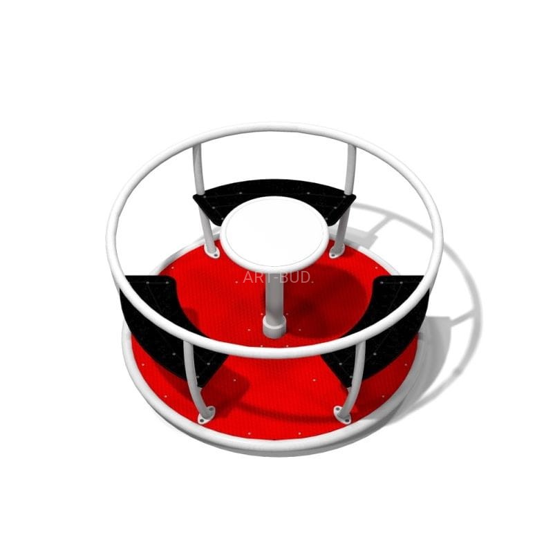 Zabawka typu karuzela tarczowa z trzema siedziskami i kierownicą napędową o średnicy 1,33 m. Podłoga karuzeli jest wykonana z płyty PE dzięki czemu podłoga karuzeli jest miękka (bezpieczna), antypoślizgowa (dodatkowa antypoślizgowa faktura) oraz nie ulega nagrzewaniu na słońcu oraz zmrożeniu zimą.