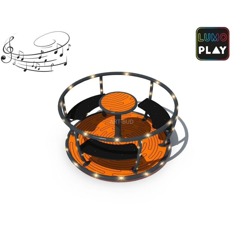 Karuzela o średnicy 1,33 m z trzema siedziskami i kierownicą napędową. Zabawka wyposażona w funkcję LUMO PLAY - unikalny system świetlny i dźwiękowy, generujący światło i dźwięk podczas ruchu urządzenia, dzięki czemu produkt jest kolorowo oświetlony i jednocześnie odtwarza zabawne melodie.