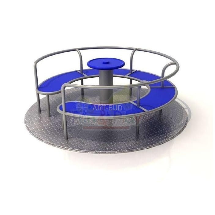 Konstrukcja karuzeli wykonana ze stali, ocynkowana ogniowo, malowana farbami akrylowymi. Platforma pokryta aluminową blachą ryflowaną o grubości 4 mm. Platforma przymocowana do rury pionowej fi 108 ze stoliiem. Urządzenie posiada mechanizm łożyskowy nie wymagający konserwacji. Elementy wykończeniowe placu mogą różnić się od przedstawionych na wizualizacji.