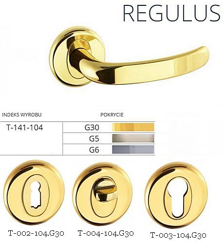 Nowoczesna klamka z serii REGULUS na rozecie , występuje w trzech  wersjach kolorystycznych i trzech wersjach tarczek na zamek: wersja do klucza, wersja do wkładki i wersja łazienkowa również jak klamki w trzech wersjach kolorystycznych: chrom, satyna oraz efekt aluminium.