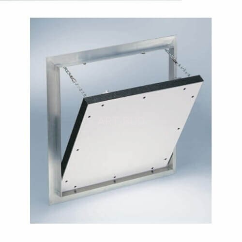 Klapa rewizyjna składa się z aluminiowych profili z wkładką z płyty gipsowo-kartonowej typu DF(GKF) 2x 12,5 mm oraz dwóch zamków zapadkowych. Obie ramy klapy rewizyjnej składają się z czterech części połączonych specjalną metodą spawania. Klapy rewizyjne przeciwpożarowe posiadają zabezpieczenie przed wypadnięciem w postaci łańcuszków. Aby zapobiec wypadkom należy zawiesić ją po każdym otwarciu i wyjęciu skrzydła drzwiowego. Klapa rewizyjna może być z powodzeniem stosowana do ścian ( bez możliwości wchodzenia). między ramą a skrzydłem drzwiowym jest szczelina szerokości 1,5 mm wypełniona na całym obwodzie piankową uszczelką przeciwpożarową. Zakryte zamki zapadkowe otwierają klapę po jej naciśnięciu.