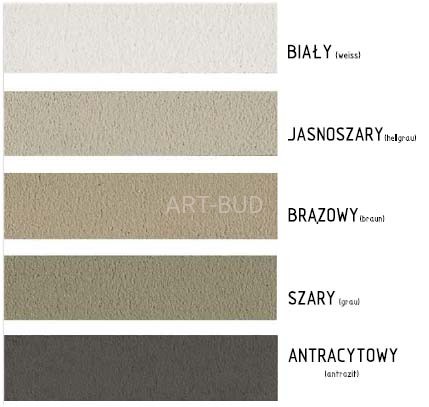 -Dostępny w 6 standardowych kolorach (białym, brązowym, jasnoszarym, szarym, szarym cementowym, antracytowym).