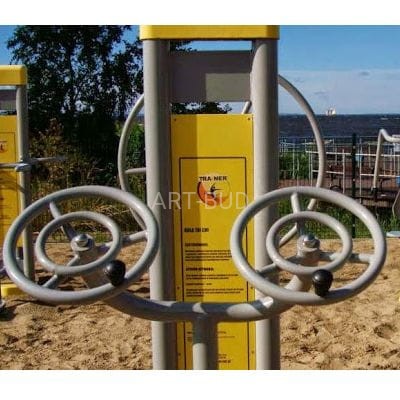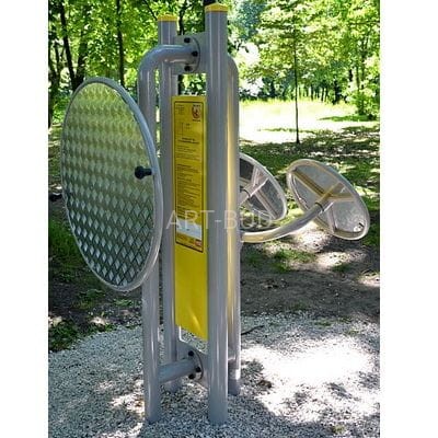Koła Tai Chi (pylon), urządzenie siłowni zewnętrznej z serii Fitness: ćwiczenia na urządzeniu wzmacniają mięśnie obręczy barkowej i ramion, poprawiają elastyczność i ruchliwość stawów ramion, łokci, nadgarstków.