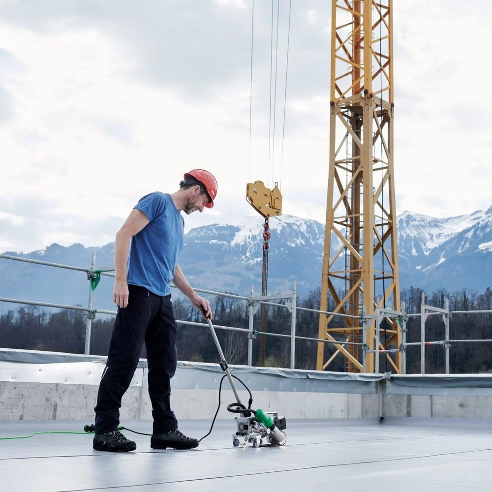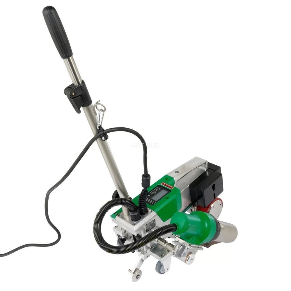 Regulacja parametrów zgrzewania (prędkość, nadmuch, temperatura) odbywa się poprzez czytelny wyświetlacz. Wąska konstrukcja i przestawna belka podwozia umożliwiają zgrzewanie na ogniomurkach oraz przy attykach w odległości tylko 8-10 cm.