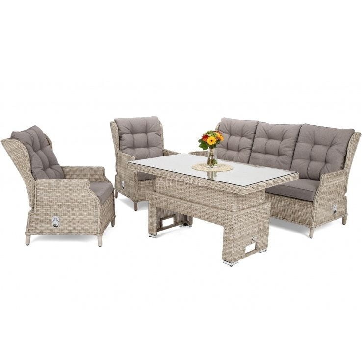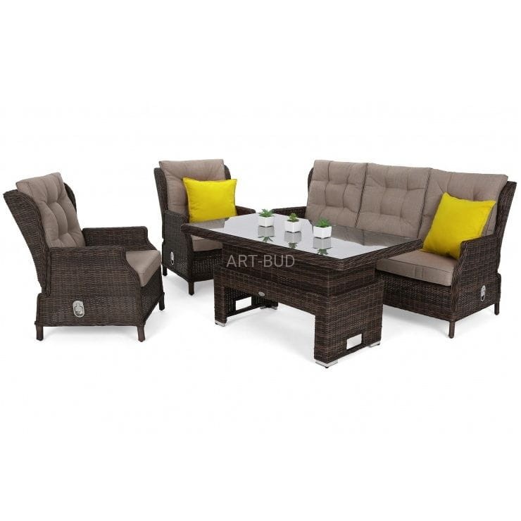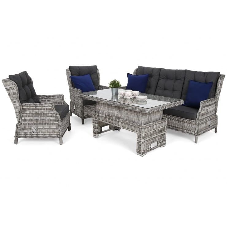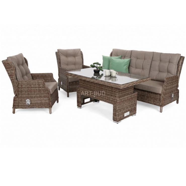 W zestawie mieści się 3-osobowa sofa, 2 wygodne fotele, duży stół z regulacją wysokości oraz z blatem wykonanym z hartowanego szkła, który z powodzeniem posłuży jako stół jadalniany.