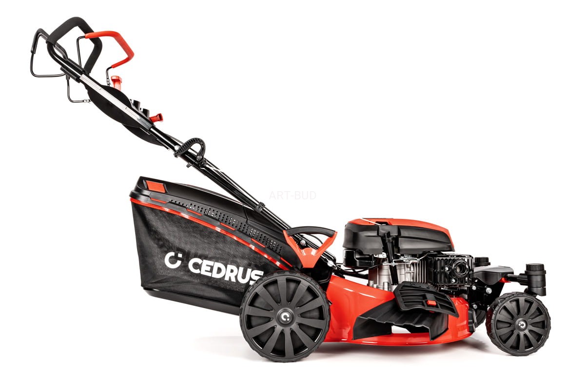 kosiarka wyposażona jest w wysokiej jakości silnik czterosuwowy Cedrus o pojemności 196 cm³, co zapewnia doskonałą wydajność. Posiada koła o średnicy 20 cm z przodu i 28 cm z tyłu, co ułatwia manewrowanie. Skrętne przednie koła dodatkowo zwiększają manewrowość. Jest to kosiarka 4-funkcyjna, umożliwiająca wyrzut boczny, wyrzut do kosza, mielenie oraz napęd. Regulacja wysokości koszenia jest dostępna w sześciu stopniach, od 25 do 75 mm. Obudowa kosiarki wykonana jest ze stali, co zapewnia jej trwałość. Szerokość koszenia wynosi 51 cm, co pozwala na szybkie koszenie dużych powierzchni. Kosz na trawę ma pojemność 65 litrów.
