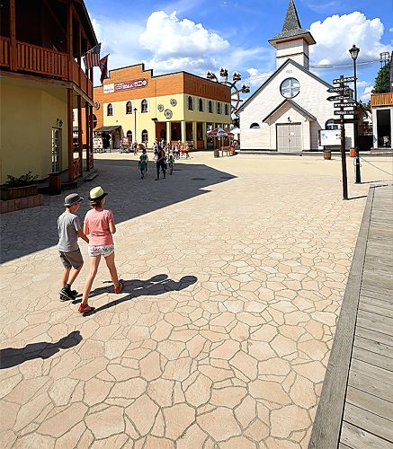 C. Na tak przygotowane podłoże układa się Polbruk według wcześniej wybranego wzoru. Polbruk posiada wypusty, pozwalające utrzymać ok. 3 mm grubości spoiny. Jeśli zachodzi taka potrzeba, kostkę należy przecinać na odpowiednich gilotynach lub przy użyciu pił do betonu.