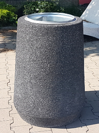 Kosz posiada wkład ocynkowany z popielnicą lub dodatkowo obręcz na worek.Kosz betonowy wykonany jest z betonu wysokiej klasy C40/50 w technologi „beton płukany” pokryty kamieniem płukanym lub mieszanką grysów. Możliwość wykonania napisu, nazwy miasta lub herbu. Betonowy kosz miejski , klasyczne uzupełnienie przestrzeni zurbanizowanych, ulic , placów , pasaży. Niezbędny element traktów pieszych i dopełnienie ławek, stołów itp. Duża waga kosza powoduje, że trudno go przesunąć i nie ma potrzeby przykręcana go do podłoża.