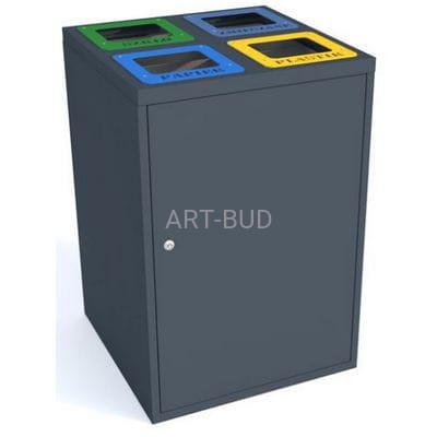 pojemników do segregacji. Kosz wykonany ze stali ocynkowanej i malowanej. Opcjonalnie dostępny również ze stali nierdzewnej. Frakcje oznaczone kolorami wg ogólnie przyjętych zasad selektywnej segregacji odpadów.