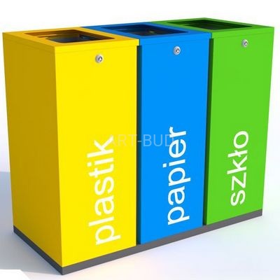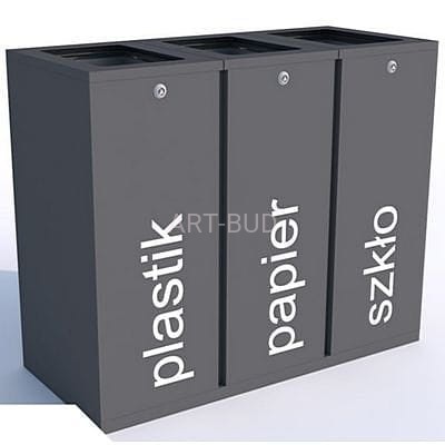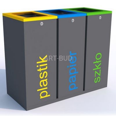 Nowoczesny kosz do segregacji odpadów z blachy ocynkowanej, pomalowanej proszkowo. Jest to kosz w prostej formie 3 prostopadłościanów z górnym niezadaszonym  otworem wrzutowym. Bardzo estetyczny, doskonale wykończony, oznakowany kolorystycznie z czytelnym napisem informacyjnym o rodzaju odpadów na każdym pojemniku. Kosz jest opróżniany po otwarciu zamykanych na klucz drzwiczek frontowych i wyjęciu metalowego pojemnika wewnętrznego.