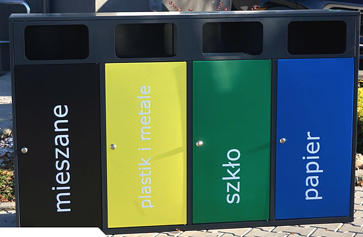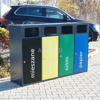Nowoczesny kosz do segregacji odpadów z blachy ocynkowanej, pomalowanej proszkowo. Jest to kosz w prostej formie zadaszonych 4 prostopadłościanów z czołowym otworem wrzutowym, umieszczonym pionowo. Bardzo estetyczny, doskonale wykończony i oznakowany kolorystycznie otwór wrzutowy oraz czytelny, nowoczesny w formie napis. Kosz jest opróżniany po otwarciu zamykanych na klucz drzwiczek frontowych i wyjęciu metalowego pojemnika wewnętrznego.Kosz do segregacji odpadów składający się z 4 pojemników do segregacji odpadów. Każdy o pojemności 120l. Wykonany z blachy 1,5mm. Możliwość doboru koloru kosza wg palety RAL.