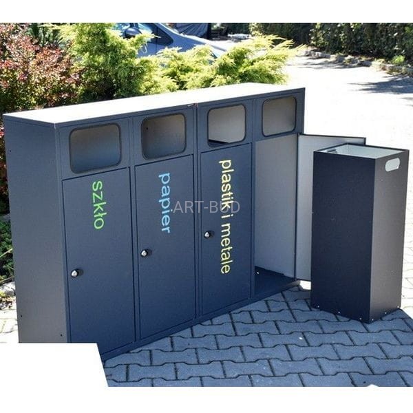 Nowoczesny kosz do segregacji odpadów z blachy ocynkowanej, pomalowanej proszkowo. Jest to kosz w prostej formie zadaszonych 4 prostopadłościanów z otworem wrzutowym umieszczonym pionowo. Bardzo estetyczny, doskonale wykończony i oznakowany, czytelny napis. Kosz do segregacji odpadów składający się z 4 pojemników do segregacji odpadów, każdy o pojemności 80l. Wykonany z blachy 0,7mm.