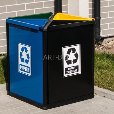 Kosz do segregacji odpadów jest przystosowany do montażu na stałe poprzez przykręcenie kołkami rozporowymi do powierzchni twardych lub wolnostojący.