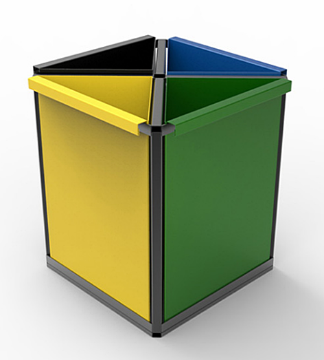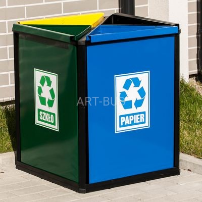 Bardzo ładny metalowy kosz odkryty na odpadki segregowane, w formie prostopadłościennego pojemnika z kopertowym podziałem wewnętrznym, na cztery komory segregacyjne. Kosz do segregacji odpadów stanowi uzupełnienie nowej serii ławek stalowych. Ze względu na troskę o środowisko firma Rekord wykonała produkt stawiając nacisk na wysoką jakość wykonania. Dlatego kosz do segregacji odpadów to prosta i elegancka forma z ogromną funkcjonalnością.