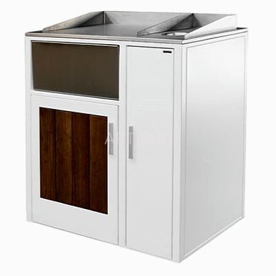 Wysokiej jakości kosz, efektownie wykończony drewnem z uchylaną pokrywą i miejscem na tace jest idealną propozycją dla galerii handlowych, lokali typu fast-food oraz wszelkiego rodzaju stołówek pracowniczych bądź szkolnych. Wykonanie ze stali czarnej lub nierdzewnej połączonej z lakierowanym drewnem gwarantuje solidność konstrukcji. Specjalne miejsce na tace z ramką wykonane stali nierdzewnej zwiększa trwałość kosza. Estetyczna forma i różne warianty łączenia stali i drewna powodują, że kosz ten doskonale wpisuje się w przestrzenie o różnorakim charakterze. Specjalne miejsce na tace wykonane ze stali nierdzewnej z ramką zwiększa funkcjonalność kosza. Wyposażony w możliwość zlewania napojów do osobnego, szczelnego zbiornika.