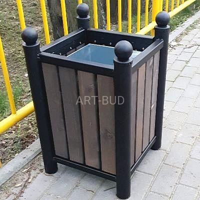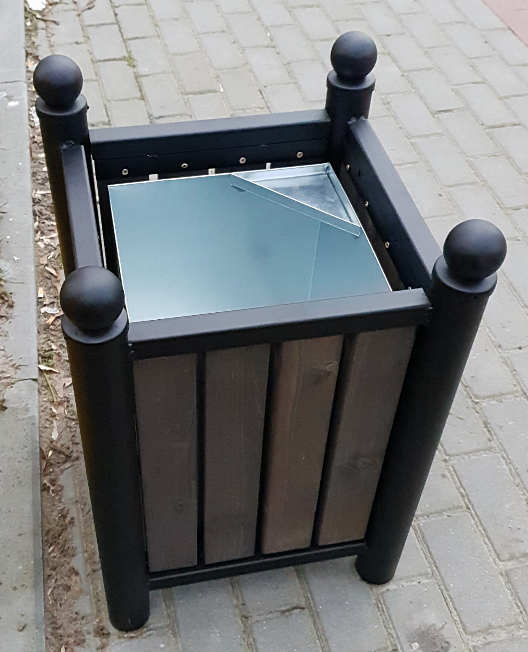 Efektowny uliczny kosz na śmieci o konstrukcji stalowej na ramie z kątownika. Jest to konstrukcja spawana, zabezpieczona lakierem proszkowym z wypełnieniem boków grubymi deskami drewnianymi. Rama jest standardowo malowana na kolor czarny, natomiast elementy drewniane zabezpieczone impregnatem wg palety kolorów do wyboru z wzornika załączonego poniżej. Kosz w formie kwadratu, którego cztery rogi zakończone są stylowymi kulami. Wewnątrz kosza znajduje się ocynkowany wkład z popielnicą.