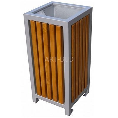 Piękny kosz miejski na śmieci, stanowiący połączenie stalowej ramy z wypełnieniem naturalnym drewnem.